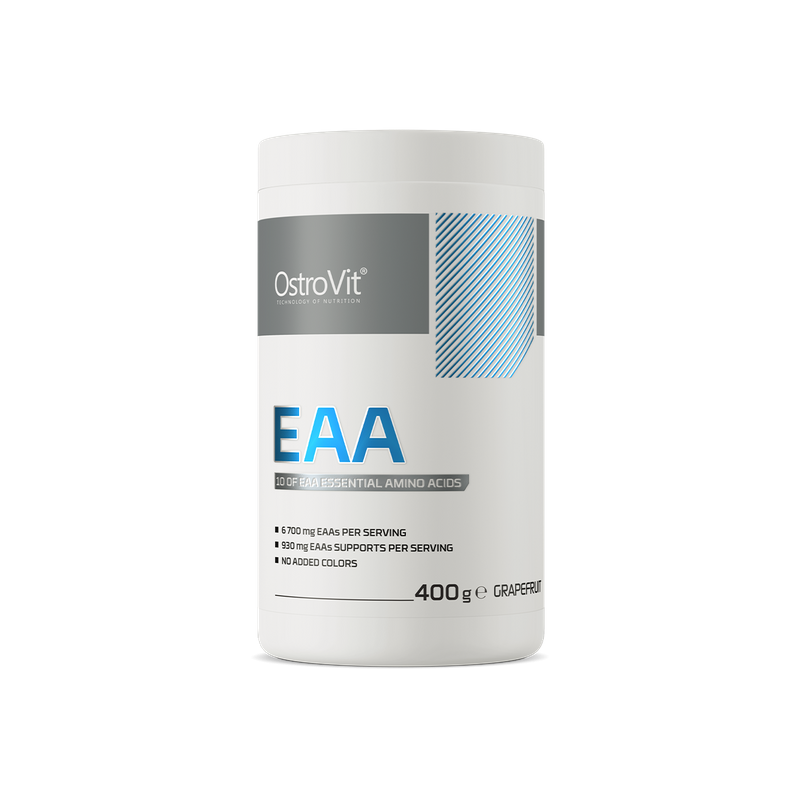 EAA z ang. essential amino acids to grupa organicznych związków chemicznych (aminokwasów), które są podstawowymi "puzlami" do budowy peptydów i białek. Nasz organizm niestety nie jest w stanie samodzielnie ich syntetyzować (produkować), więc tak ważnym jest aby dostarczać je wraz z prawidłową dietą lub z pomocą suplementacji. W składzie znajdziemy kompleks BCAA czyli trzech aminokwasów długołańcuchowych: Leucyny, Waliny i Izoleucyny oraz takie związki jak: Lizyna, Treonina, Fenyloalanina, Metionina, Arginina, Histydyna oraz Tryptofan. Kompleks OstroVit Supreme Pure EAA dzięki aminokwasom białkowym wspierają regenerację oraz procesy anaboliczne naszych komórek mięśniowych. Komponenty suplementu przyczyniają się do wspierania oraz same bezpośrednio uczestniczą w szeregu procesów życiowych naszego organizmu wspierając układ immunologiczny, nerwowy oraz trawienny.