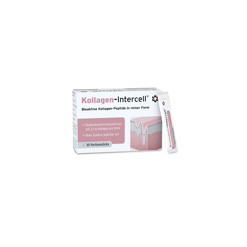 Kollagen-Intercell zawiera 100% peptydów kolagenowych, fragmentów kolagenu, które są lepiej przyswajalne dla organizmu niż standardowe pełne białko.1,2 Kolagen jest składnikiem skóry, kości, mięśni i ścięgien. Niestety wraz z upływem lat zmniejsza się jego ilość wytwarzana przez organizm.