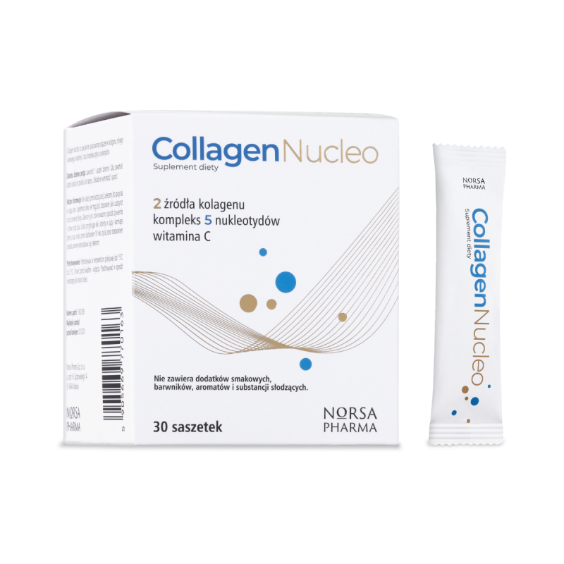 Collagen Nucleo to specjalnie opracowane, wzajemnie uzupełniające się połączenie kolagenu rybiego i wołowego, łagodnej dla przewodu pokarmowego witaminy C oraz kompleksu pięciu czystych nukleotydów dietetycznych.
