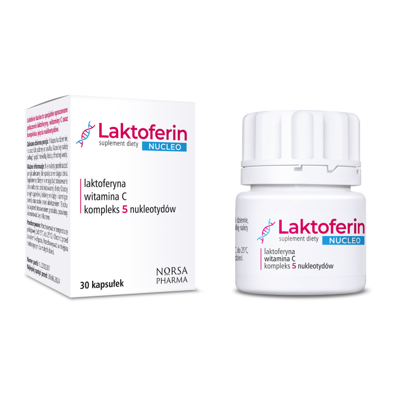 Laktoferin NUCLEO to dedykowane połączenie pięciu czystych nukleotydów, najwyższej jakości laktoferyny oraz łagodnej witaminy C.