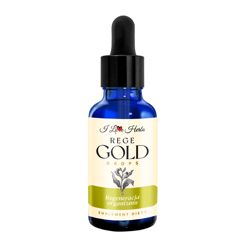 REGE Gold Drops REGENERACJA Krople Ziołowe od I Love Herbs Suplement Diety 50ml - to mieszanka wyselekcjonowanych ekstraktów wodno-alkoholowych o dużym stężeniu składników pochodzących z ziół. Wyrób powstał na bazie naturalnych ekstraktów roślinnych (na zimnym etanolu) przeznaczony jest do stosowania jako uzupełnienie diety w wybrane składniki roślinne. Zioła i pozostałe surowce użyte do produkcji przechodzą u Nas selekcje pod względem jakości, świeżości i czystości. Szczególny nacisk kładziemy na jakość i skuteczność produktu. Korzyści jakie płyną ze stosowania naszych kropli Gold Drops tworzą bardzo długą listę. Ich powstanie nie jest przypadkowe - to lata doświadczenia naturoterapeutów, którzy są praktykami i używają tych roślin z powodzeniem w swoich gabinetach. Mają one potwierdzone badaniami skuteczne działanie, często bez efektów ubocznych dla większości osób. Jednak pamiętaj, że to są bardzo skoncentrowane składniki i jeśli używasz leków koniecznie skonsultuj się z lekarzem prowadzącym. Nasz cel to utrzymać proporcje objętościowe składników względem etanolu 1:1 - dzięki temu nasz wyrób wyróżnia się małą zawartością alkoholu w stosunku do wyekstrahowanych składników. Dzięki temu już tak mała porcja dzienna jak 1,5ml jest wystarczająca, aby dostarczyć wybrane składniki roślinne do organizmu. Dzięki temu krople Gold Drops realnie i zauważalnie go wspomagają.